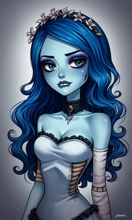 | 训练词汇 | 1girl,emily(corpse bride),zombie girl,colored skin(blue skin),scars,stitches,blue hair,wavy hair,long hair,blue eyes,pink lips,flower wreath,white veil,strapless dress,white dress,blue-trimmed dress,wedding dress,fingerless white gloves,torn clothes已复制! |