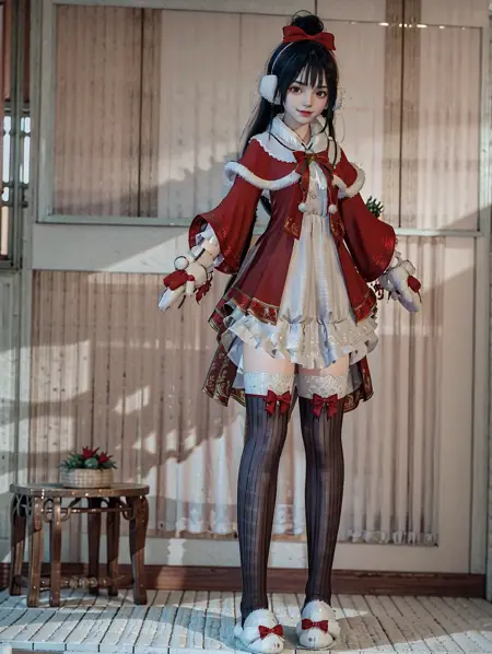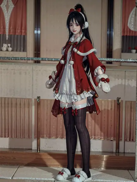 lora:\[衣服\]-\[林中鹿-天刀少女\]TDSVlzl\_v2:0.7,1girl,(loli:1.2),solo,hairball earmuffs,fur-trimmed_gloves,vertical-striped_legwear,black_thighhighs,white fluffy slippers,happy,standing,(full body:1.6),indoor,tile_floor,christmas_tree,(looking_at_viewer:1.2),(best quality),((masterpiece)),