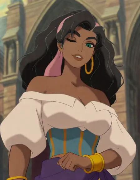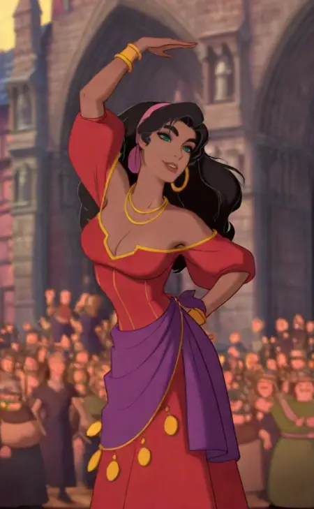 Trained on 21 images from the animated film 'Hunchback of Notre Dame,' this is the Illustrious XL version of Esmeralda.