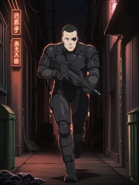 Positive: masterpiece, best quality, amazing quality, 1boy solo toned mature_male male sitting leaning_back, smoking_cigarette cigarette, holding_beverage, bar, stool, neon_lights, science_fiction, source_anime, anime, anime coloring, saito_gits, black hair, buzz_cut, eyepatch, black eyes, open dark grey dress_shirt, jewelry, black pants