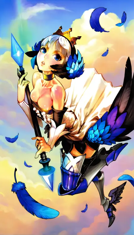 gw3nd0lyn, 1girl, solo, 흰 머리, 곧은 앞머리, 머리 뭉치, 올림머리, 보라색 눈, 금관, 푸른색과 검은색 깃털 머리핀이 달린 검은 머리띠, 흰색 코르셋 드레스, 검은색 분리형 소매, 흰색 팔보호대, 푸른색과 보라색 날개, 검은 갑옷 치마, 보라색과 은색 갑옷 허벅지 부츠