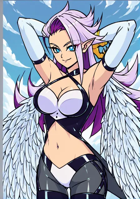 Harpy, monster girl, purple hair, midriff, navel, pointy ears, feathered wings, blue eyes,