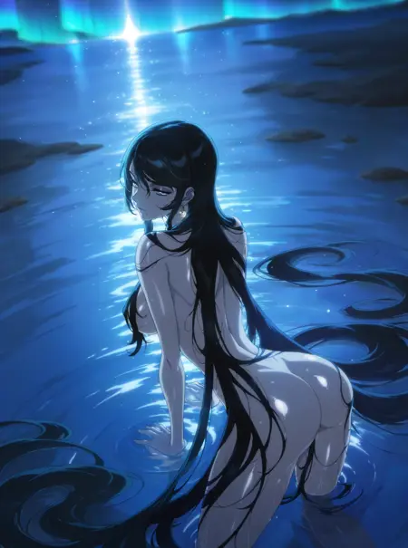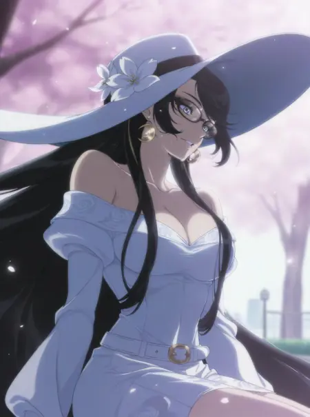 Tags : bayofate, black hair, very long hair, large breasts, bangs, grey eyes, mole under eye, glasses, earrings, mole, mole under mouth