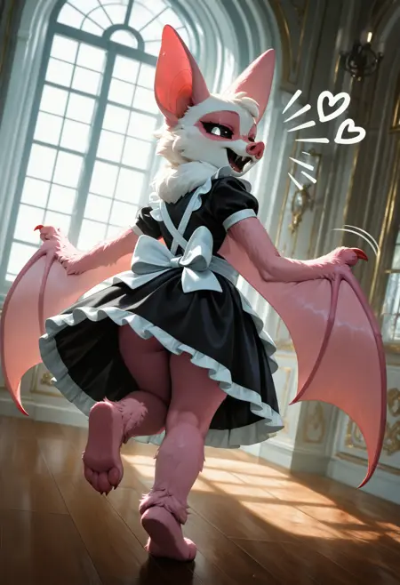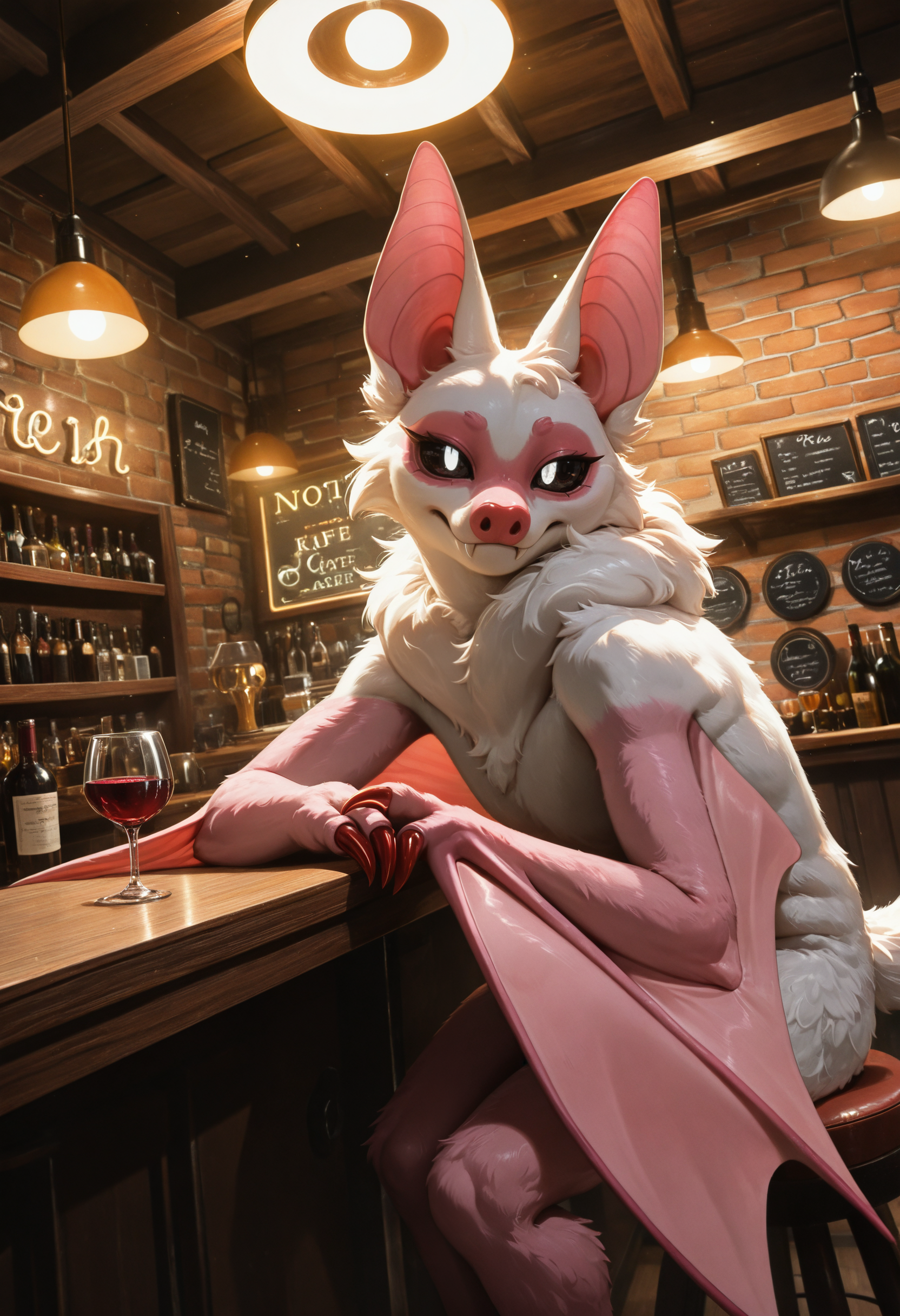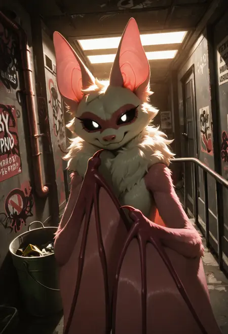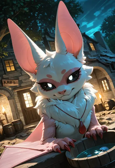 // Illustrious: rab1e_b4by, adult female, red claws, bat, bat ears, membranous wings, white fur, anthro, body fur, fur, bat ears, pink fur, two-tone fur, wings, tuft, black sclera, white puppil