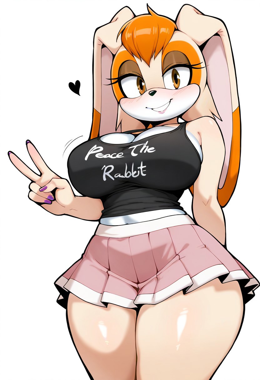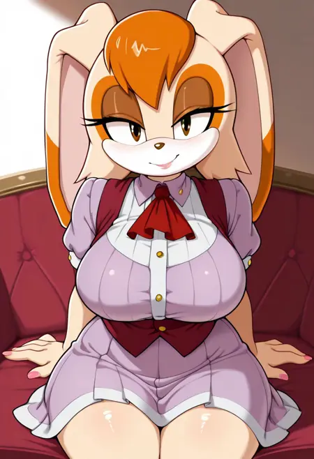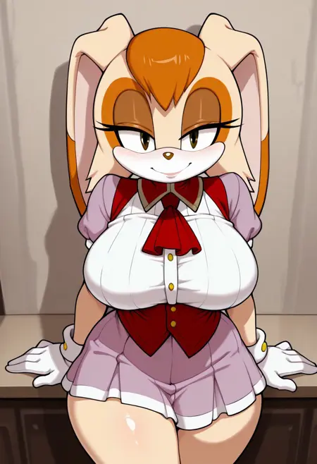 Prompt: バニラ・ザ・ラビット、桃色の肌、オレンジ色の髪のつむじ、ヘーゼル色の目、茶色のアイシャドウ、黒い鼻、金色のボタン付きバーガンディーのフィットしたベスト、ラベンダーのドレス、ラベンダーのスカート、白い手袋
