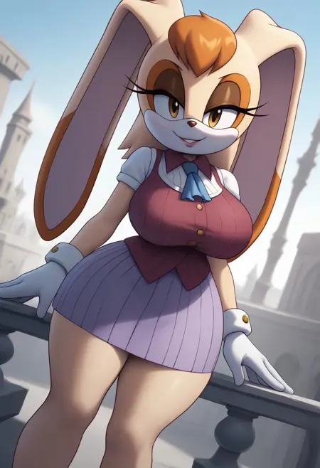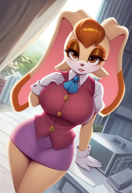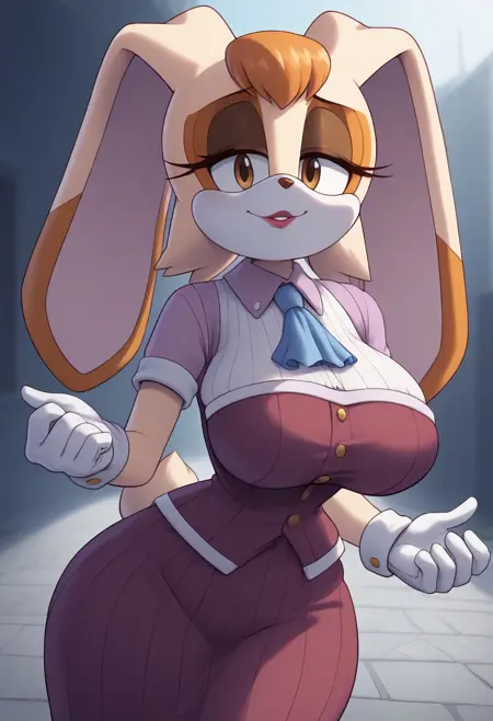 Prompt: Vanilla the Rabbit, 桃色皮肤,橙色发髻,榛子色眼睛,棕色眼影,黑色鼻子,酒红色修身背心配金色纽扣,薰衣草色连衣裙,薰衣草色裙子,白色手套