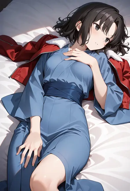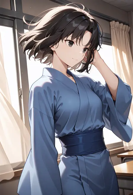 基础:r_shiki, 1girl, 复古艺术风格, 单人, 短发, 分开刘海, 黑发, 黑眼, 蓝色和服, 日本服饰, 腰带, 长袖, 小乳房,
