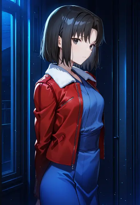 红色夹克:r_shiki, 1girl, 复古艺术风格, 单人, 短发, 分开刘海, 黑发, 黑眼, 红色毛皮镶边夹克, 蓝色和服, 日本服饰, 腰带, 长袖, 小乳房