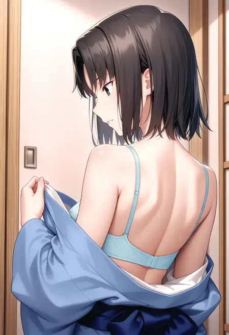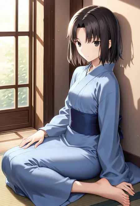 Base: r_shiki, 1girl, retro artstyle, solo, short hair, parted bangs, black hair, black eyes, shiki blue kimono, japanese clothes, sash, long sleeves, small breasts,
