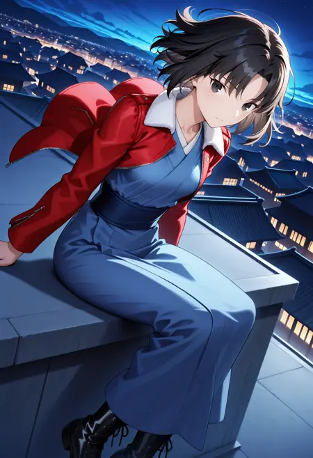 red jacket: r_shiki, 1girl, retro artstyle, solo, short hair, parted bangs, black hair, black eyes, red fur-trimmed jacket, shiki blue kimono, japanese clothes, sash, long sleeves, small breasts