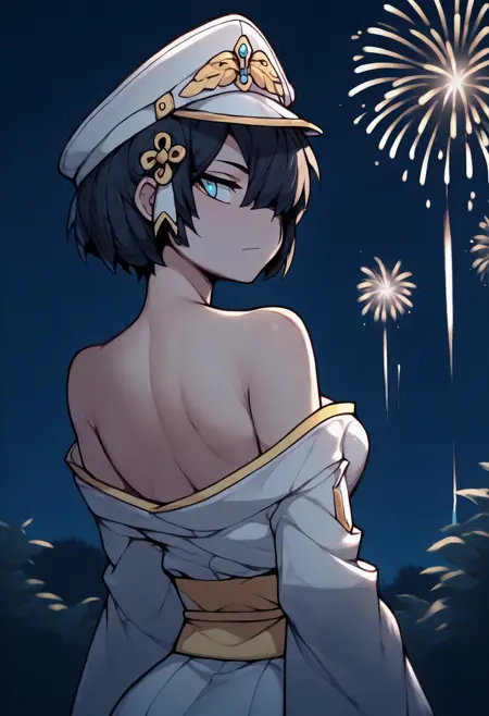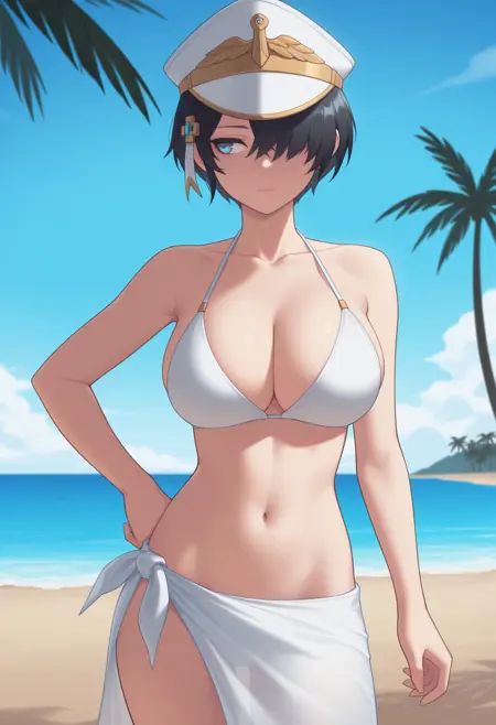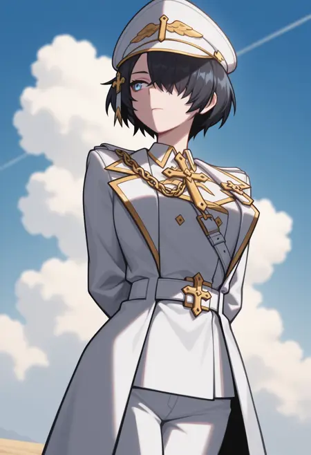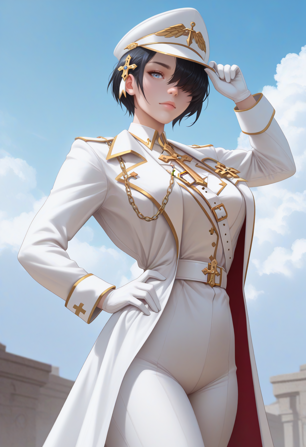 默认服装: 白色头饰, 尖顶帽, 军装, 金色镶边, 白色外套, 开襟外套, 长袖, 白色夹克, 白色腰带, 肩带, 白色衬衫, 有领衬衫, 十字架, 金链, 白色手套, 白色长裤