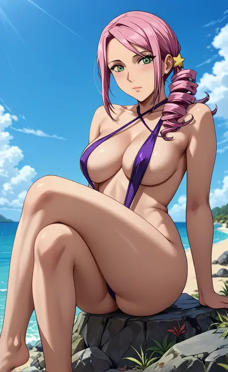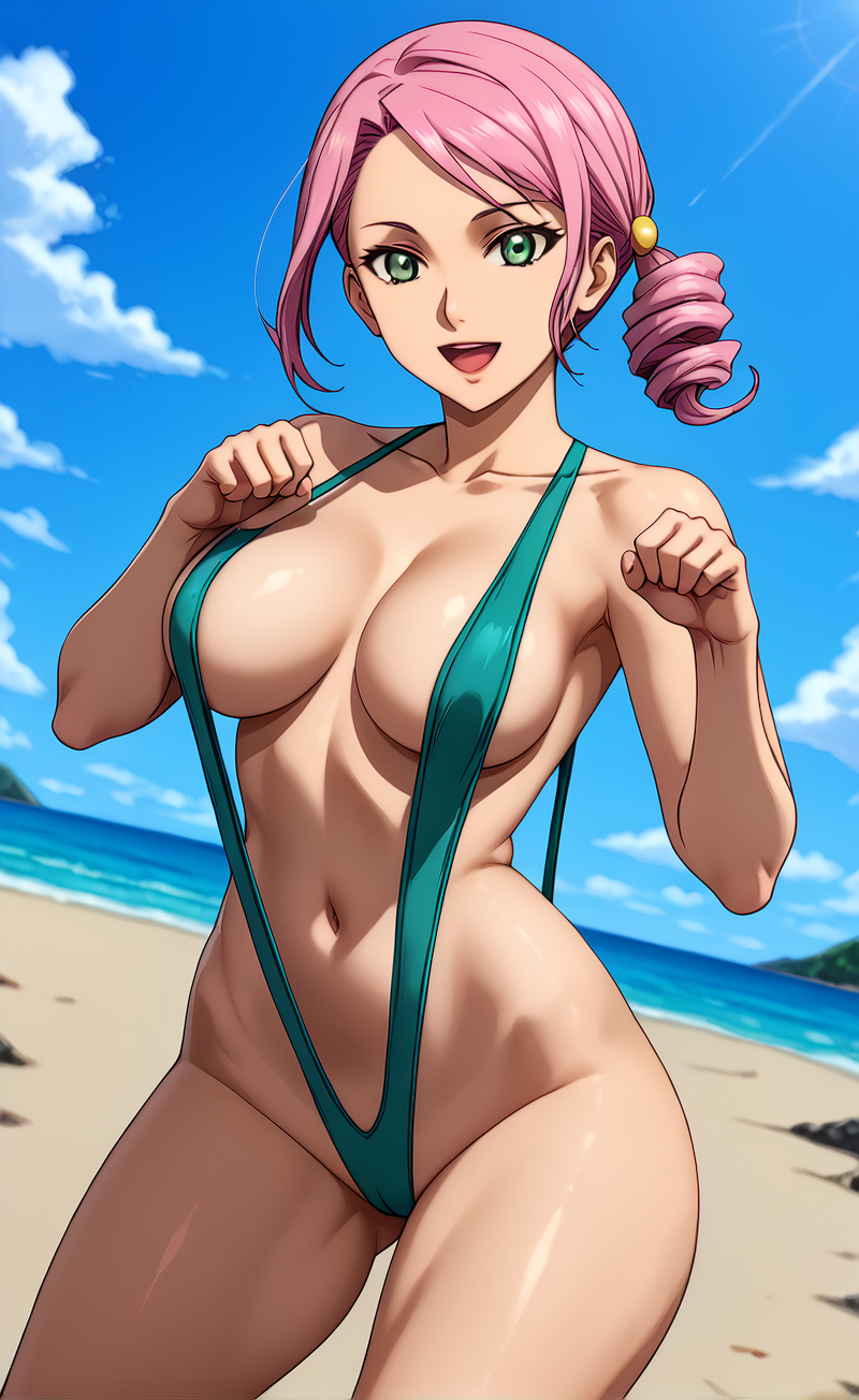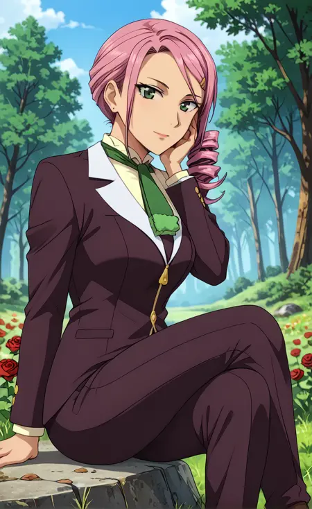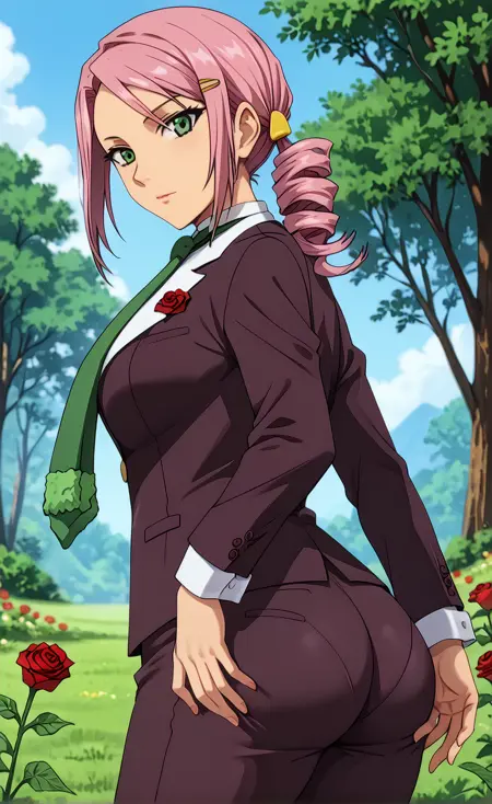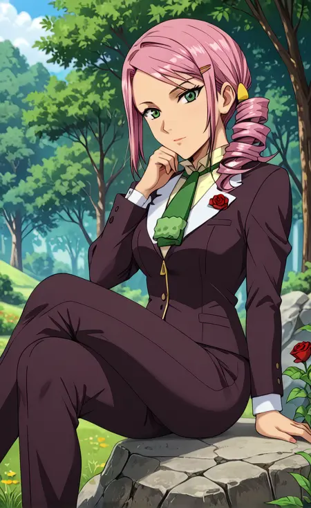 (绿色眼睛,粉色头发,单侧马尾卷发,发饰,:1.2),