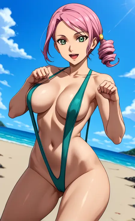 (녹색 눈, 분홍색 머리카락, 한쪽 팔머리 드릴 헤어, 헤어 장식,:1.2),