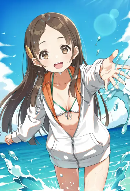 china-swim,kuramoto china,brown eyes,brown hair,long hair,hair ornament, white hoodie,white bikini