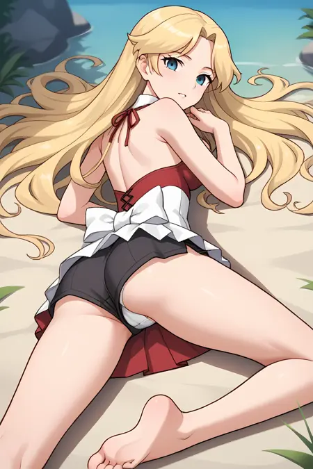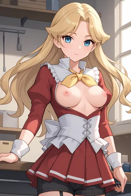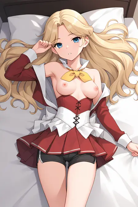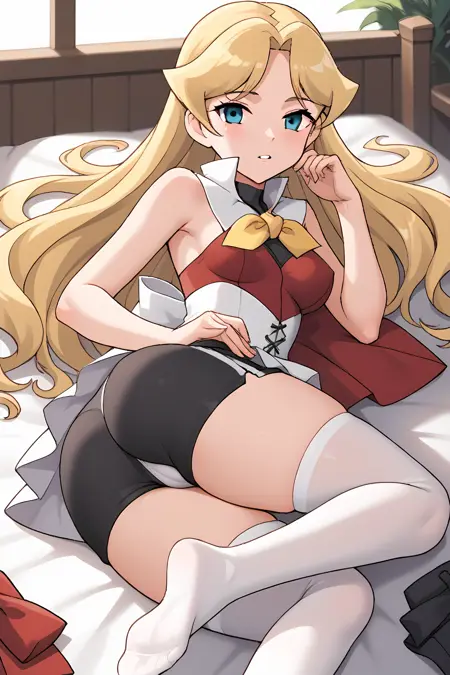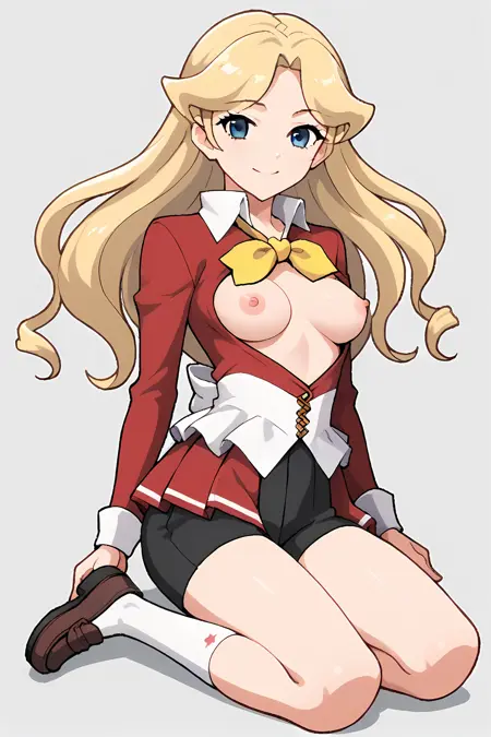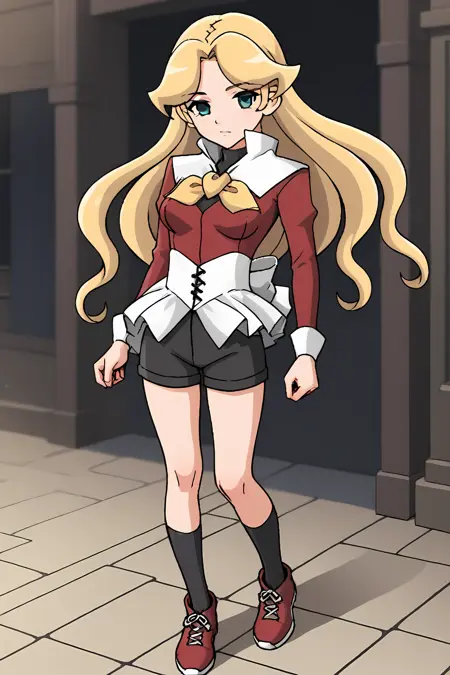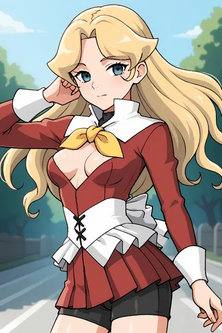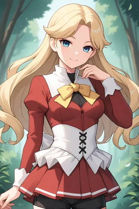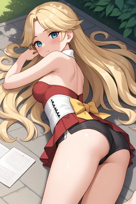 red dress white corset yellow bow red mini skirt black shorts red shoes