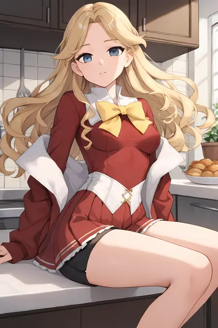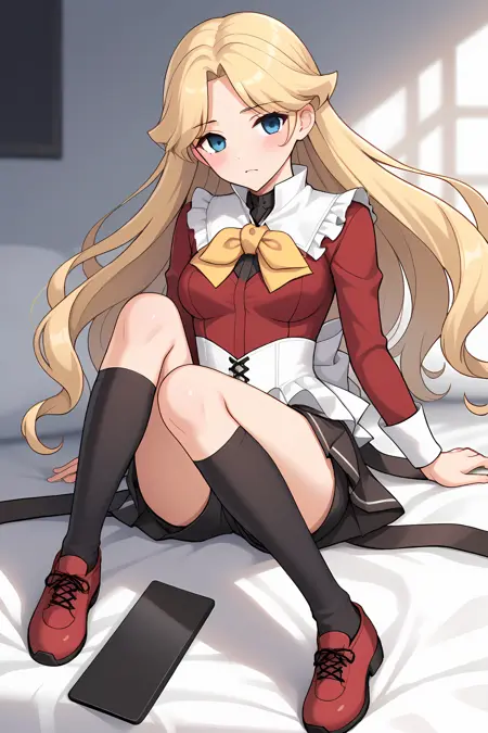 blue eyes, blonde hair, long hair, parted bangs, parted hair, curly hair