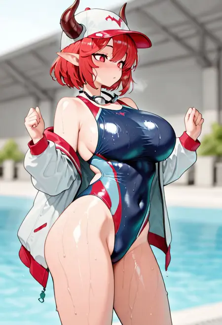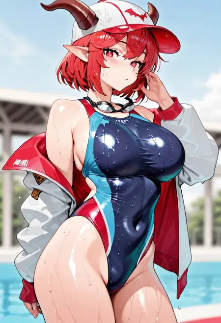 yuze, 1girl, 短发, 大胸部, 红眼, 帽子, 胸部露出, 红发, 棕色角, 尖耳, 一体式泳衣, 肚脐覆盖, 高开衩, 白色夹克, 护目镜, 竞技泳衣, 护目镜挂在脖子上,