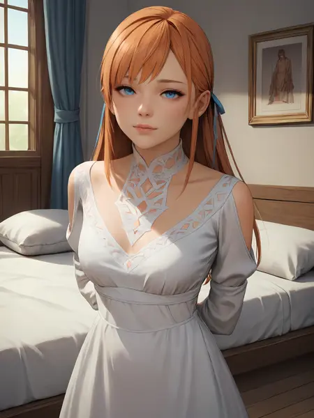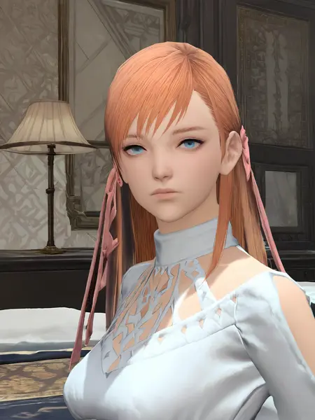 lora:ryne_FF14_Illustrious:1, ryneFF14, blue eyes, long hair, orange hair, bangs, hair ribbon,