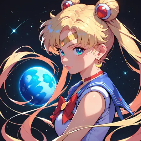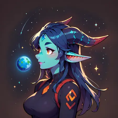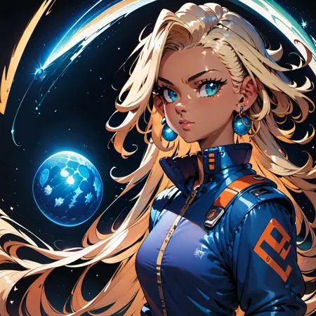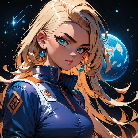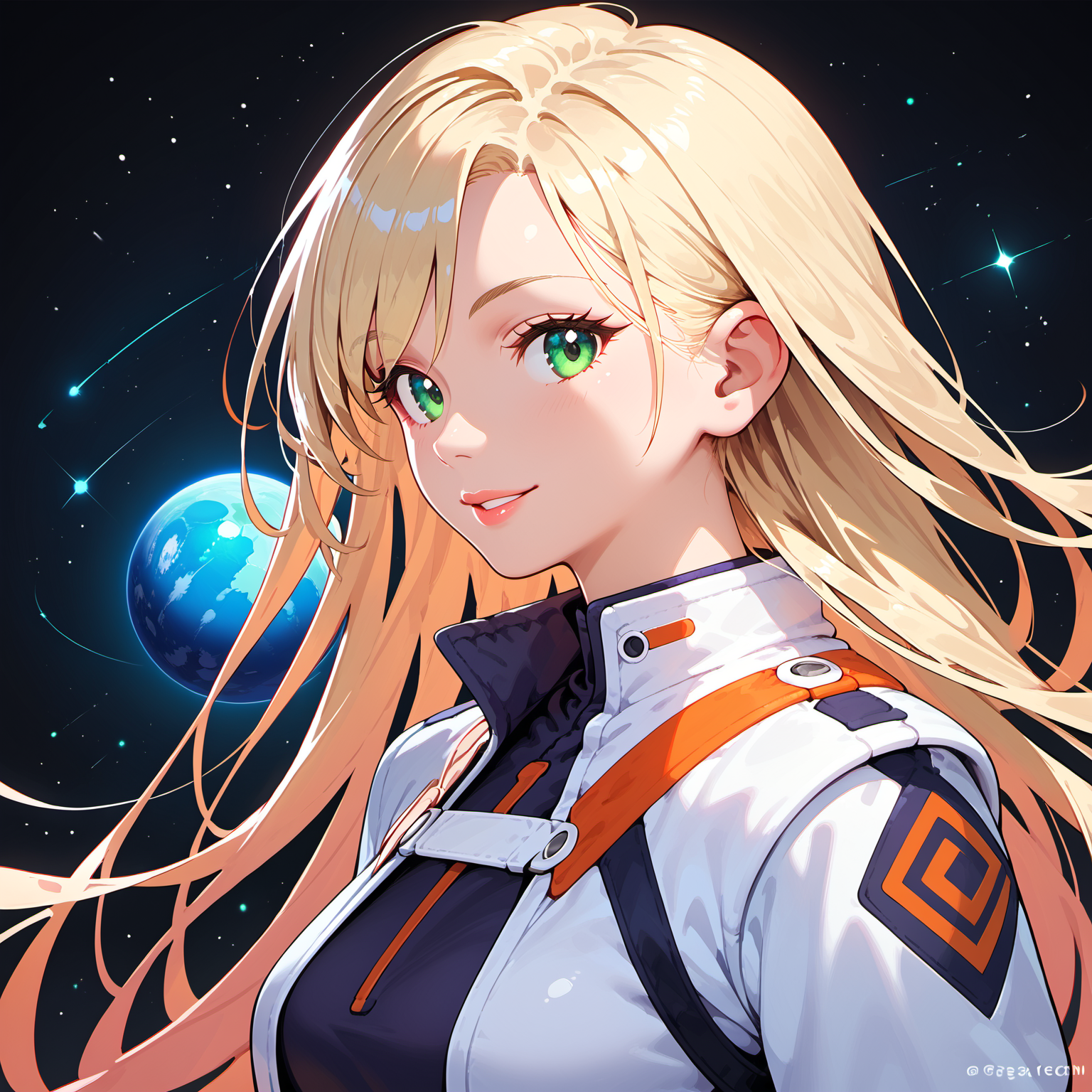 长格式提示词:女性,外太空,星星,中等大小乳房,侧面视角,微笑,长金色头发,嘴唇,绿色眼睛,蓝色星球,注视观众,太空服