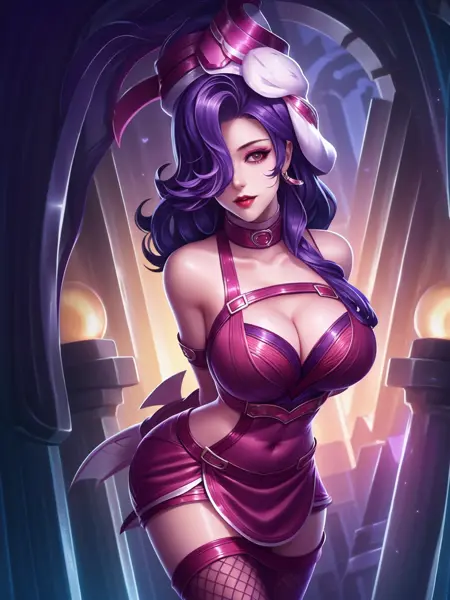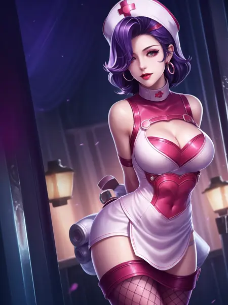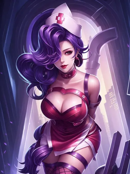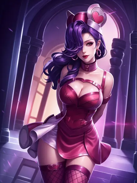 - WZRYakeAXHL, 1girl, solo, white gloves, breasts, dress, jewelry, heart, looking at viewer, earrings, cleavage, sleeveless dress, pink lips, elbow gloves, bare shoulders, medium hair, high ponytail, cleavage cutout, purple hair, thighhighs, brown eyes, large breasts, hair over one eye, sleeveless, asymmetrical legwear, cityscape, night, mature female, pool, headgear,