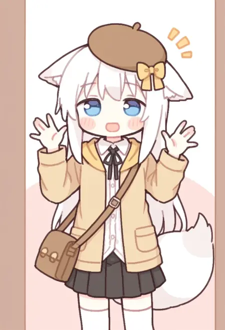 Clothes (with jacket): brown beret, hat bow, yellow bow, white shirt, buttoned shirt, neck ribbon, black ribbon, yellow collared brown jacket, black pleated skirt, shoulder bag, white thighhighs
