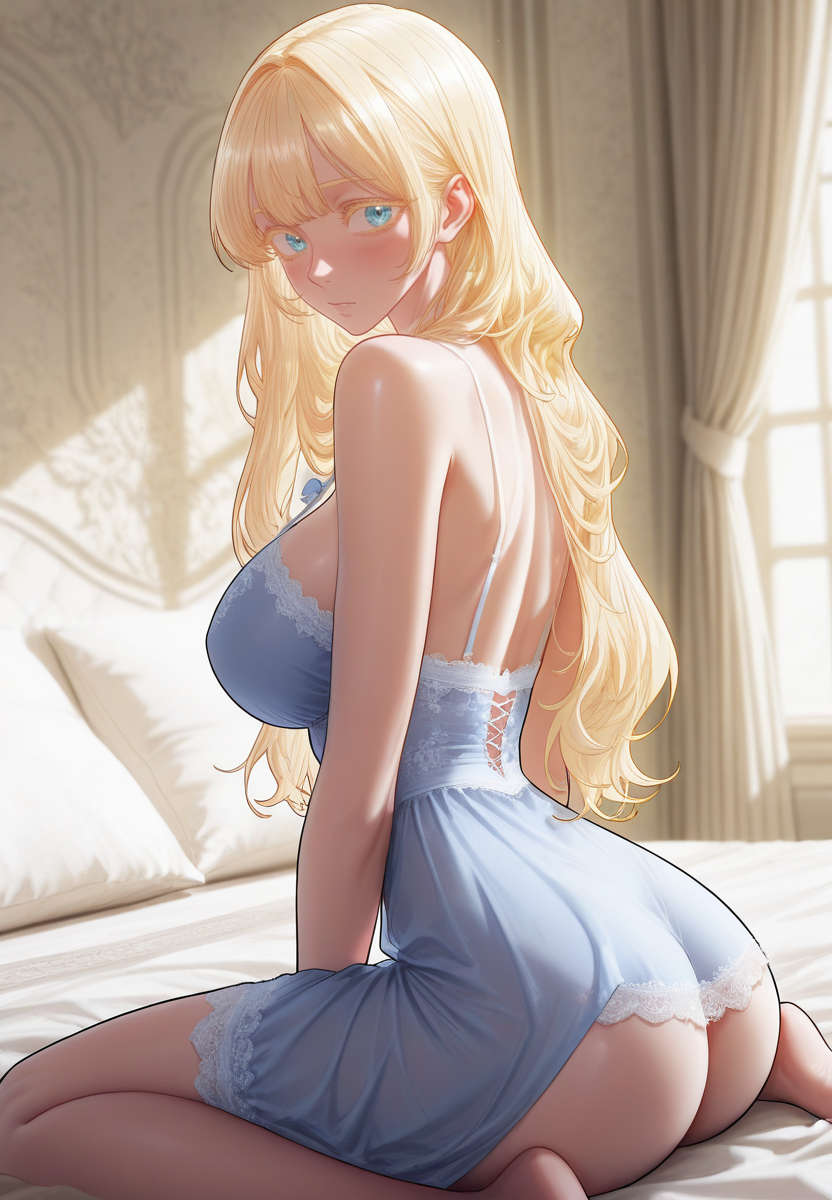 luanabilkiam, 1girl, blonde hair, blue eyes, yellow eyelashes, bangs, very long hair
