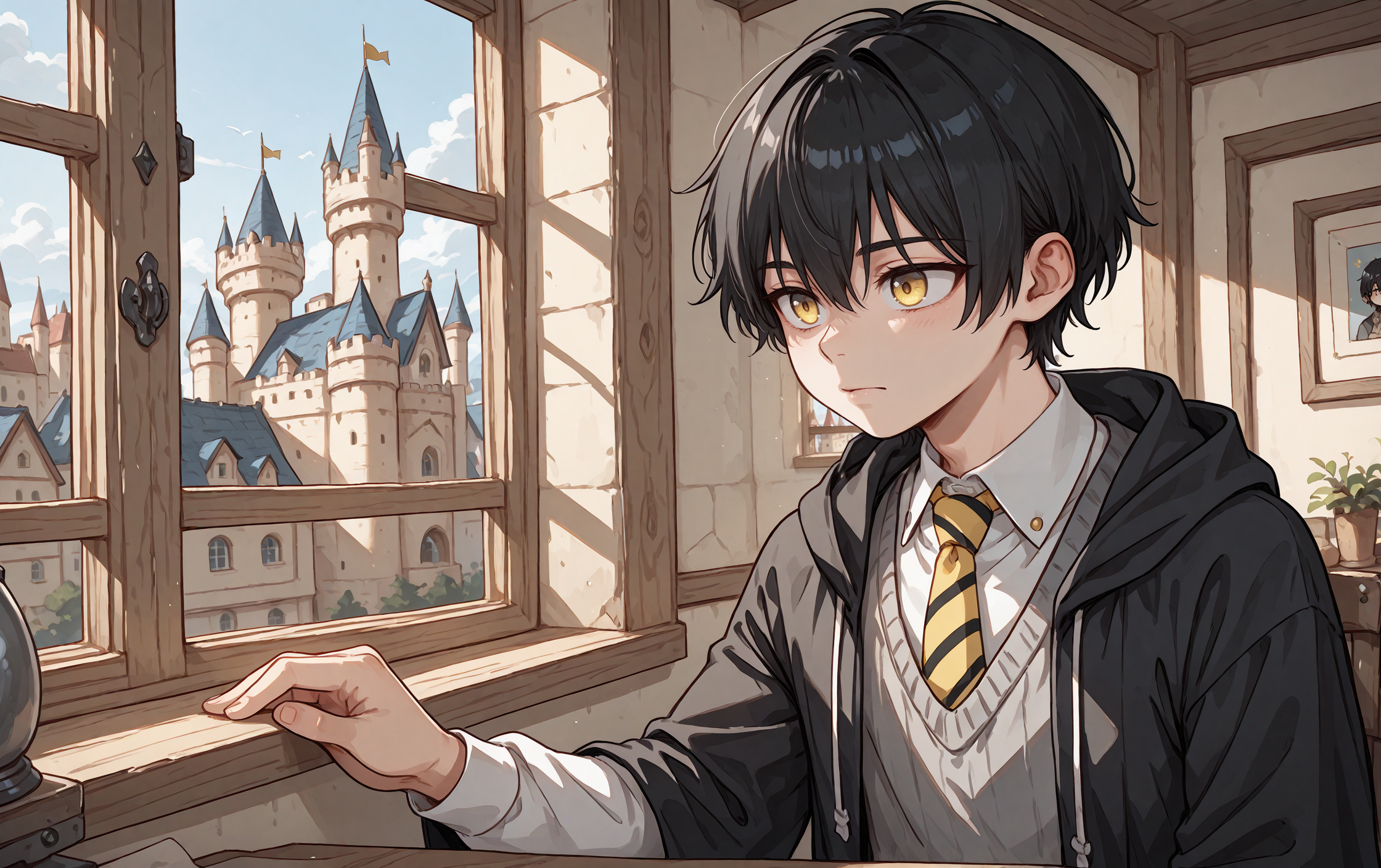 r3y, solo, 1boy, black hair, goatee, yellow eyes, scar,