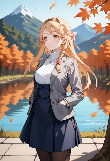 KlaudiaFirst, long hair, side braid, hairband, hair bow, white capelet, shoulder cutout, cleavage, blue neck ribbon, frilled shirt, elbow gloves, partially fingerless gloves, high-waist skirt, blue skirt, black pantyhose