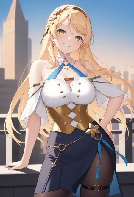 KlaudiaSecond, long hair, braid, hairband, hair ornament, white choker, o-ring halterneck, off-shoulder shirt, white shirt, golden corset, blue skirt, side slit, black pantyhose, thigh strap