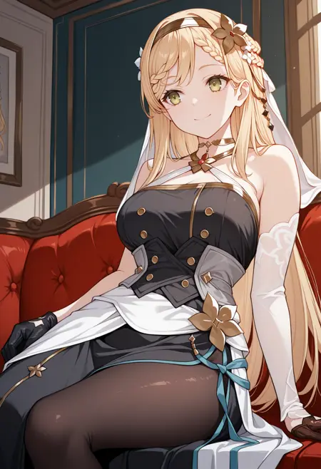 KlaudiaThird, long hair, braid, hairband, hair flower, white veil, golden choker, halterneck, black dress, single white sleeve, single brown glove, underbust, buttons, side slit, white overskirt, black pantyhose