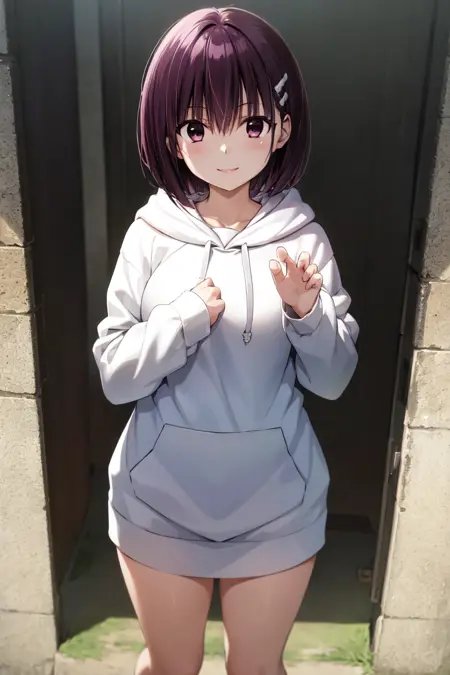 "Kanade Suzu, short hair, hairclip, drawstring, white hoodie"