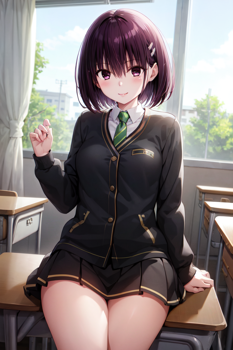 "Kanade Suzu, short hair, hairclip, school uniform, black skirt, black jacket, dress shirt, green necktie"