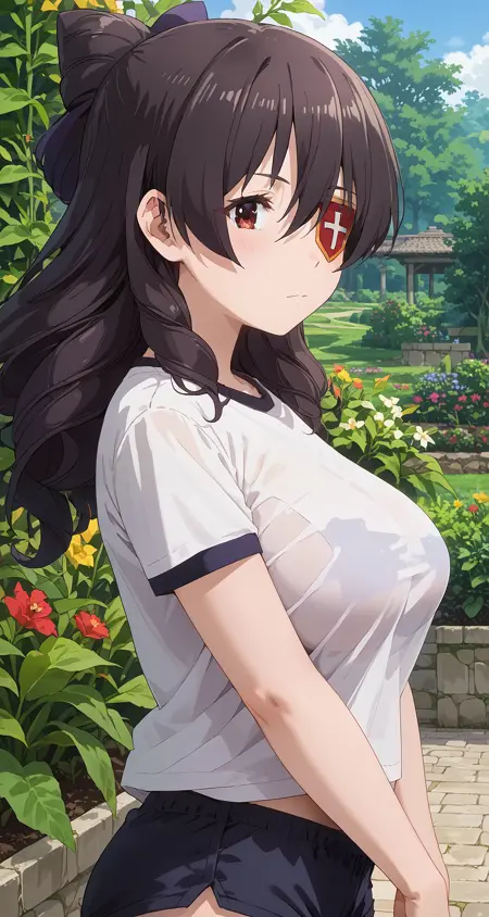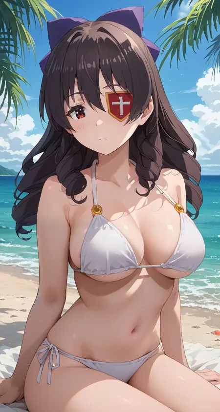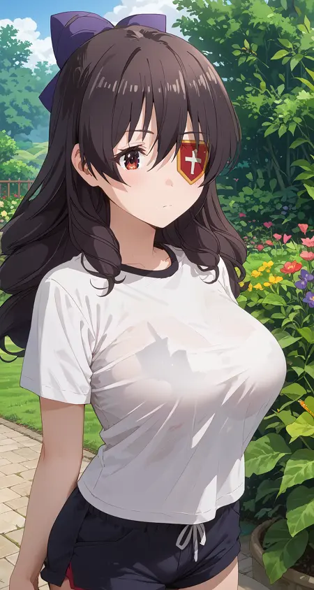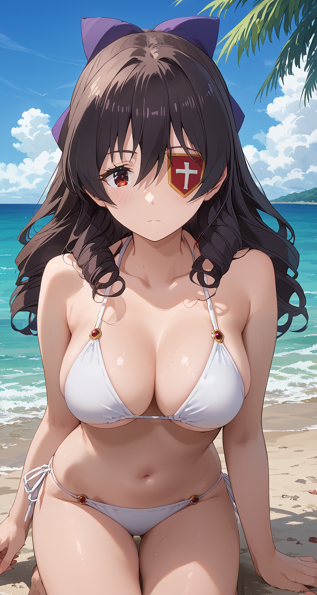 캐릭터: konosuba_arue, 긴 머리, 검은 머리, 눈 사이의 머리카락, 머리 장식, 뾰족한 머리, 붉은 눈, 안대, 큰 가슴,