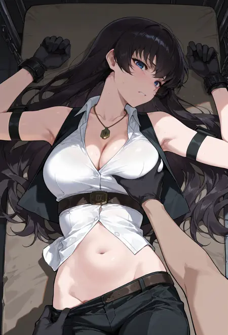 Roberta, blue eyes, black hair, black pants, black gloves, sleeveless, armband, collared shirt, white shirt, belt, vest, pendant,