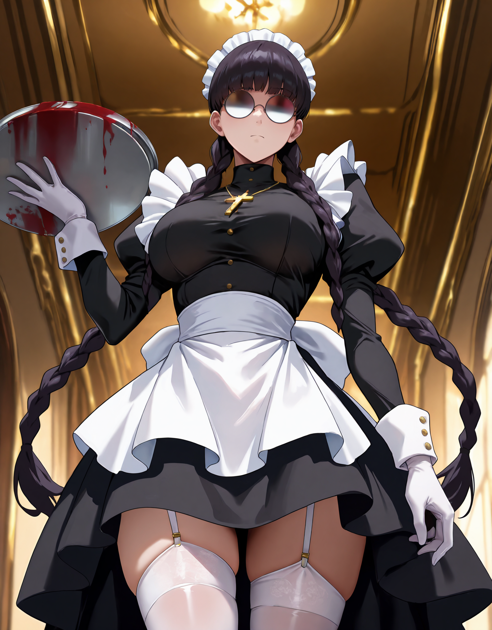 Roberta, round eyewear, maid headdress, twin braids, blue eyes, cross necklace, white gloves, white thighhighs, garter straps, maid apron,black dress, puffy sleeves, mary janes,