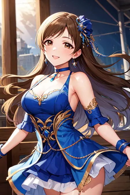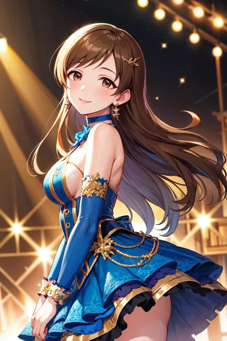 服装1aanitta, 长发, 发饰, 中等胸部, 耳环, 蓝色项圈, 偶像服装, 蓝色连衣裙, 露肩, 无袖, 手腕袖套, 分离式袖子, 偶像大师