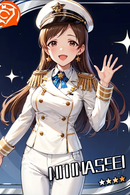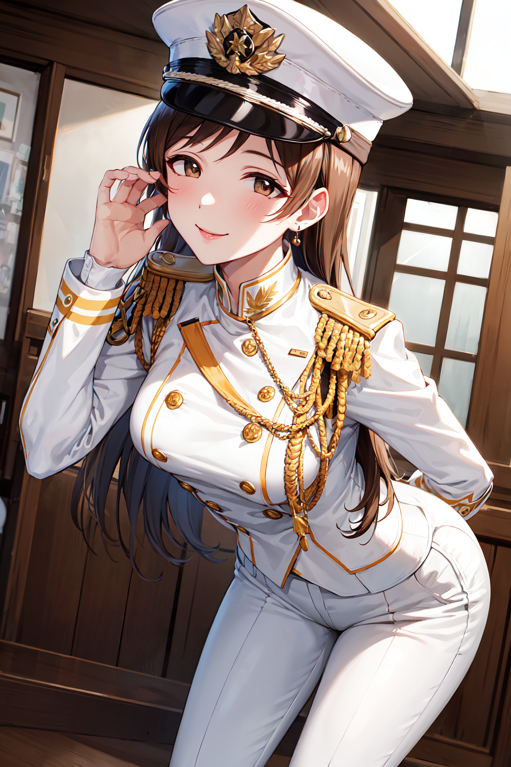 服装2aanitta, 长发, 尖顶帽, 耳环, 中等胸部, 军装, 肩章, (白色衬衫:1.2), 白色袖子, 长袖, 白色长裤, 偶像大师