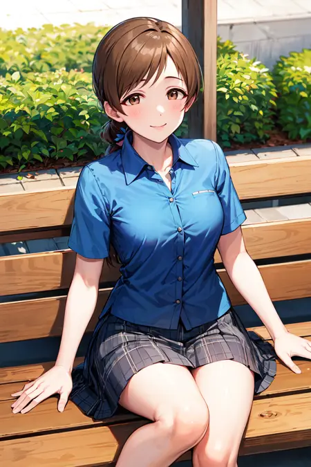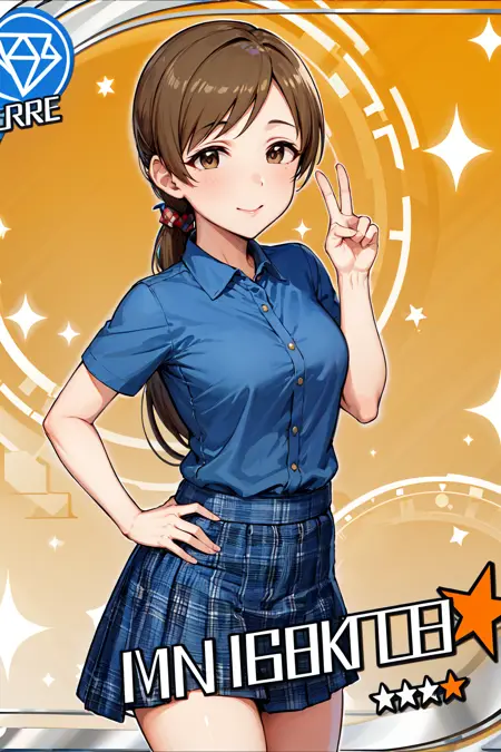 服装3aanitta, 极长发, 长发, 低马尾, 中等胸部, 蓝色衬衫, 短袖, 有领衬衫, 格子裙, 超短裙, 偶像大师
