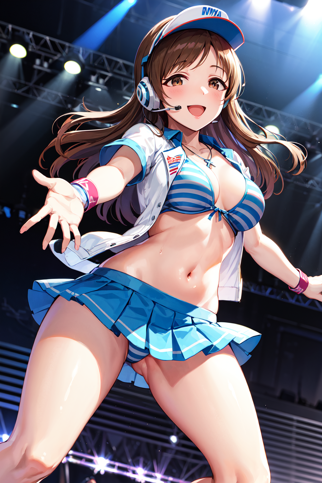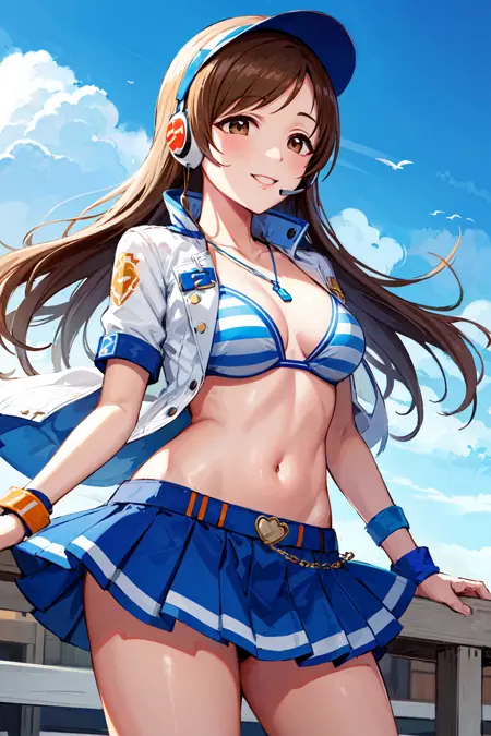 服装4aanitta, 长发, 遮阳帽, 耳机, 中等胸部, 项链, 饰品, 蓝色比基尼, 条纹, 白色夹克, 开放式服装, 短袖, 手环, 蓝色短裙, 百褶裙, 偶像大师