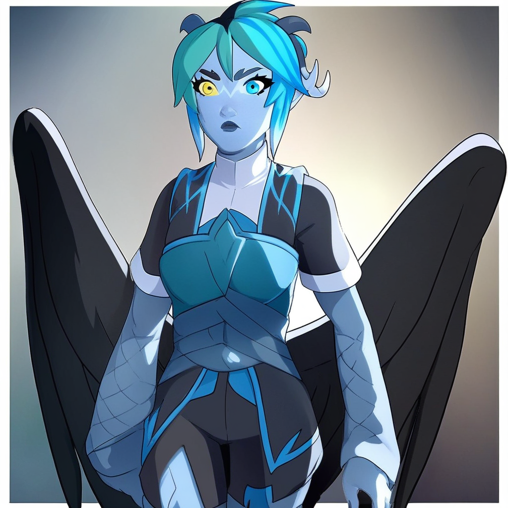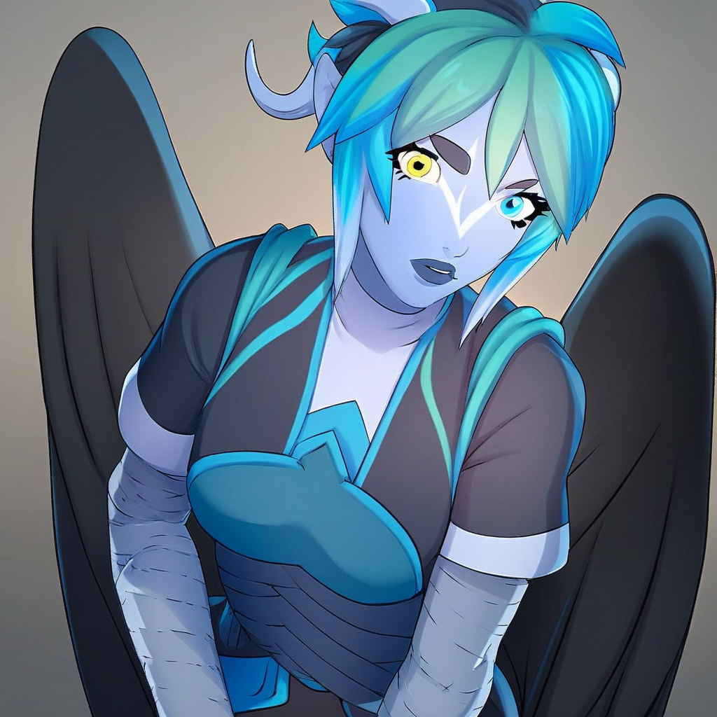 heterochromia, wings, yellow eyes, multicolored hair, green hair, horns, bandages, black hair, blue eyes, short hair, colored skin, two-tone hair, black wings, bandaged arm, bangs,
