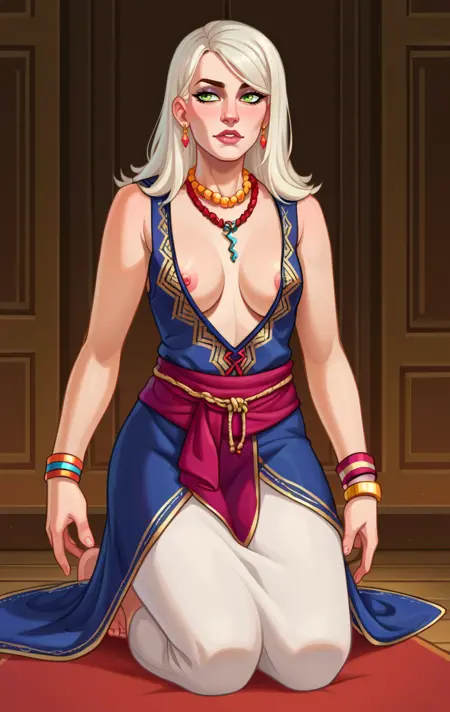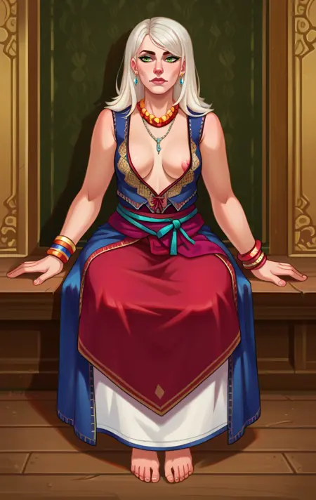 KeiraMetzSDXL,1girl,green eyes,jewelry,white hair,earrings,barefoot,necklace,bracelet