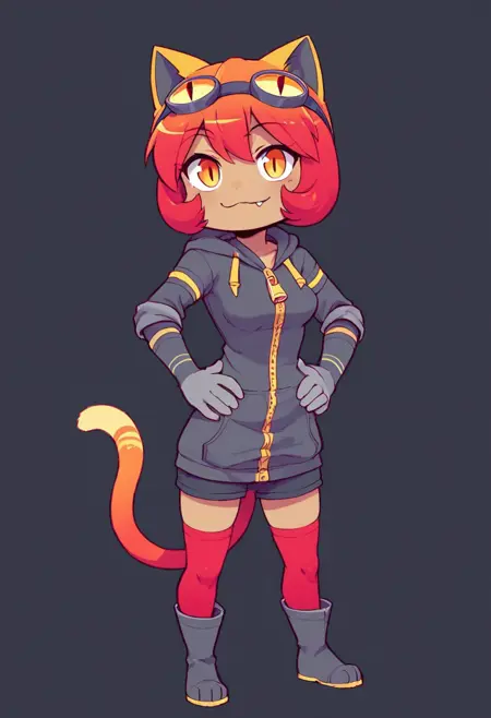 기타 프롬프트: 꼬리, 몸 털, 고양이소녀, 인간 스타일 손, 송곳니, 주황 빨간 머리, 회색 옷, 소매 장갑, 허벅지 길이 빨간 양말, 고양이 발바닥 무늬 부츠, 노란 부츠 바닥, 후드집업 앞쪽 지퍼, 발 하나당 4개의 발가락, 발은 발바닥, 발 하나당 4개의 발가락, 회색 발바닥, 중간 크기 가슴, 갈색 젖꼭지,