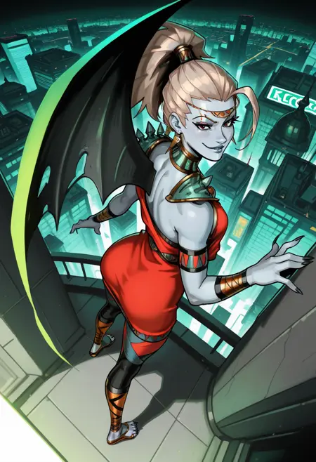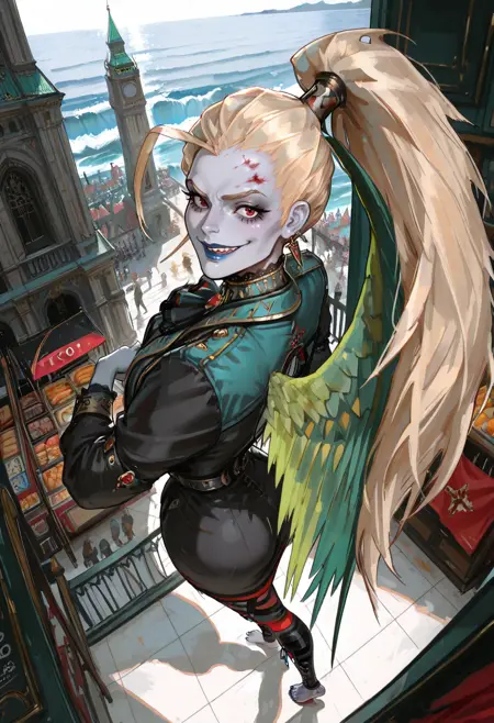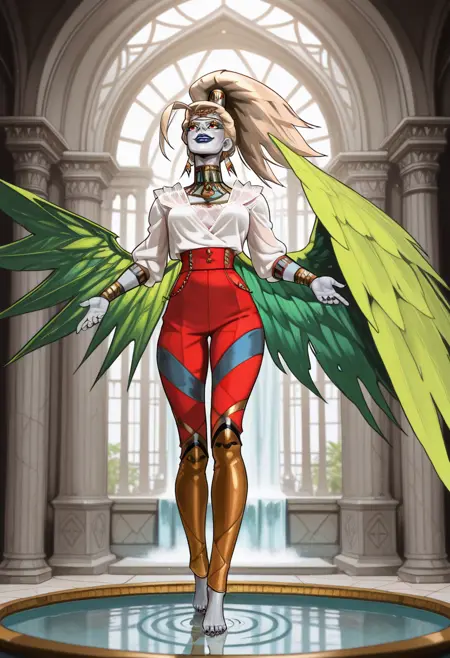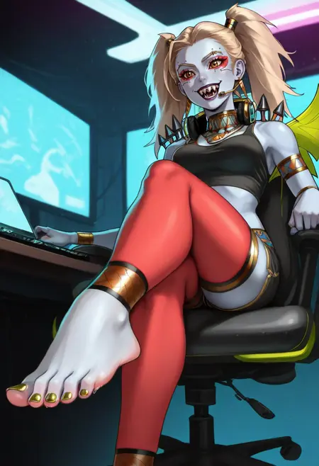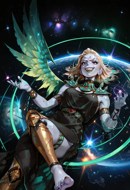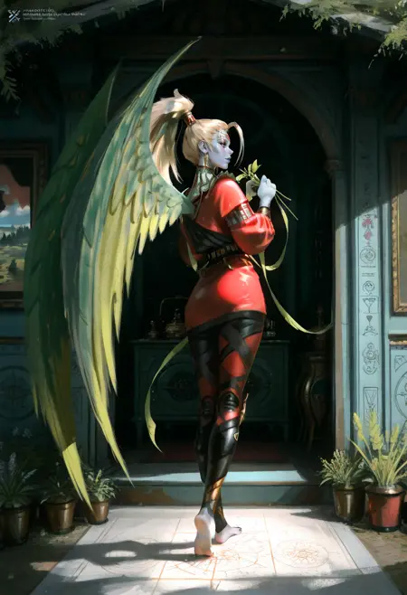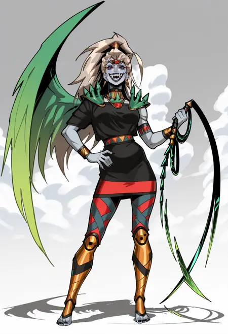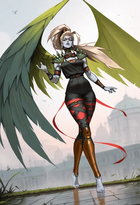 プロンプトを使用してください: Alecto、色付きの肌、灰色の肌、青い肌、片方の緑の翼、素足、黒いつま先のネイルポリッシュ、足趾。