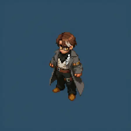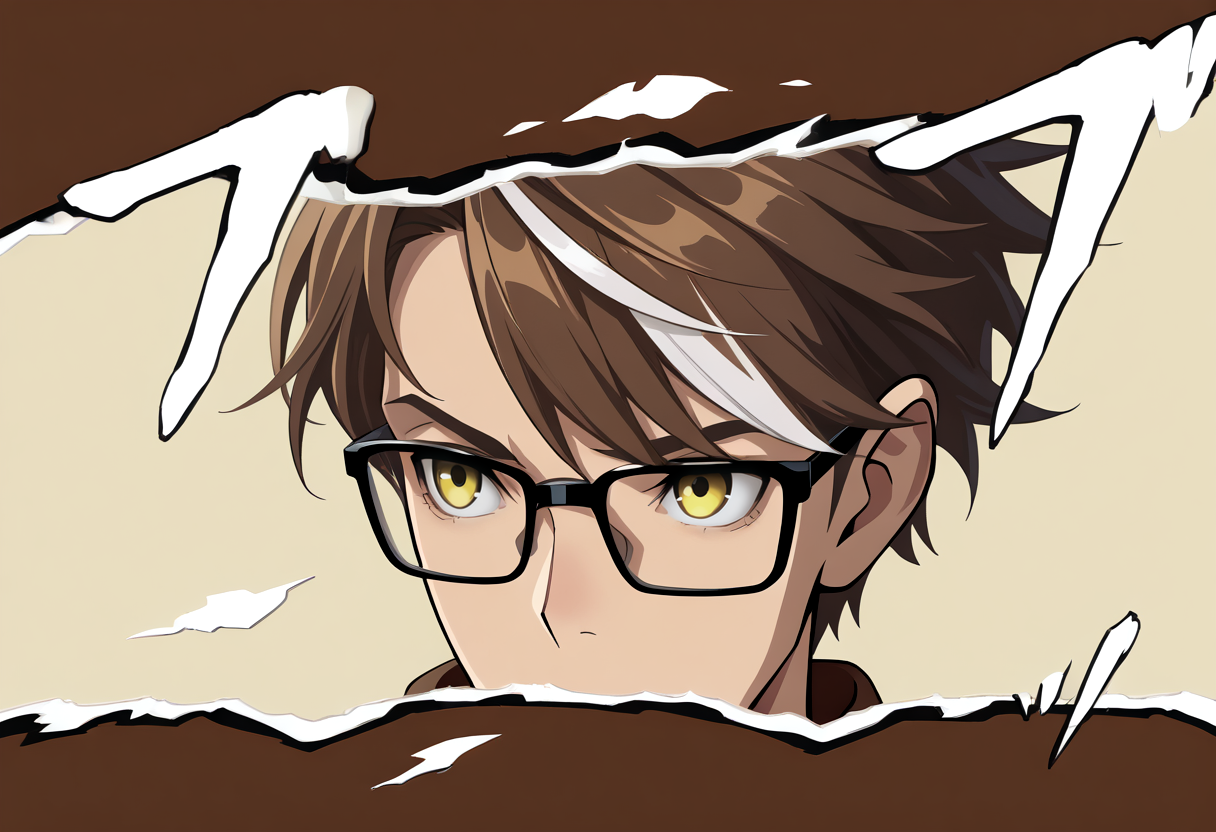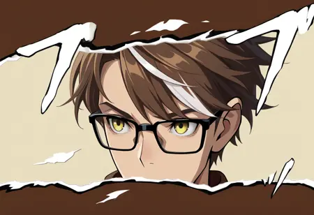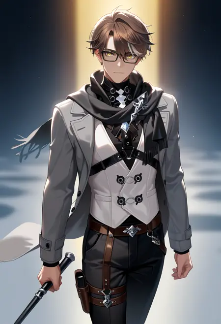 프롬프트: 갈색 머리, 흰색 스트라이프, 단발, 노랑색 눈, 스트라이프 머리, 흰색 머리, 검은색 안경 프레임, 검은색 속옷, 흰색 조끼, 벨트, 회색 코트, 옷 안의 조끼, 검은색 스카프, 검은색 바지, 브로치