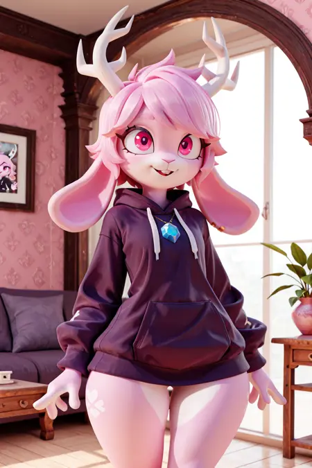 トリガー: Fszt、男性、パステルピンクの体、パステルピンクの髪、ピンクの目、ふわふわ、たれ耳、アンスロ、ウサギ型、ジャッカロープ、(白いツノ)、出歯、フェムボーイ、長いまつ毛、広い腰、長いフーディー、濃い紫の服