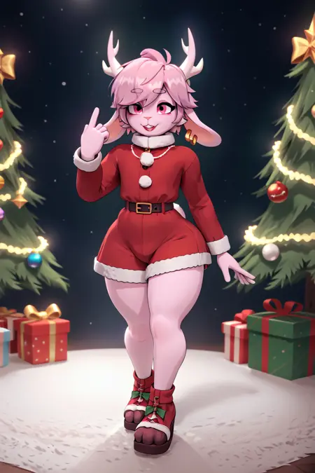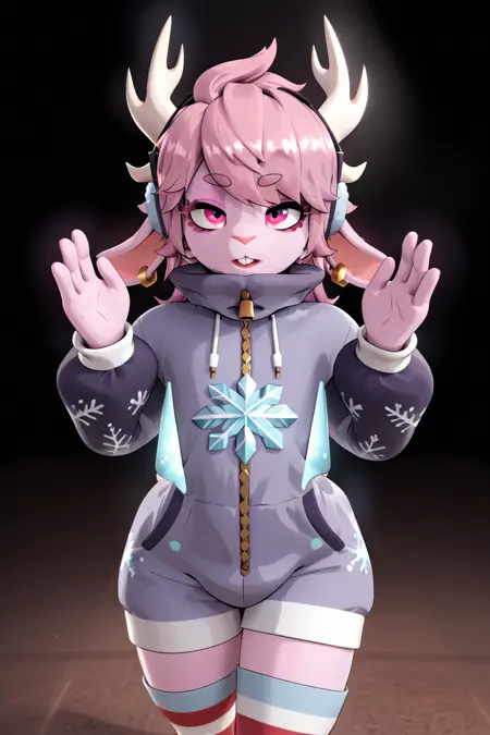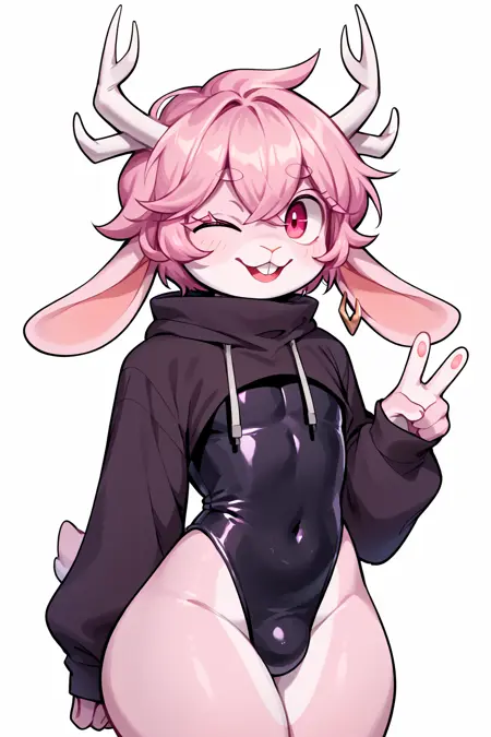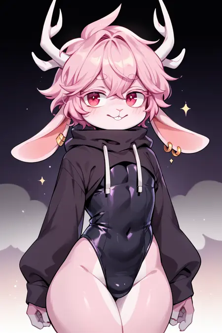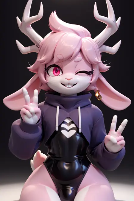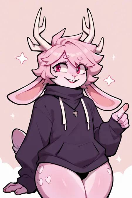 触发词:Fszt、男性、淡粉色身体、淡粉色头发、粉色眼睛、毛茸茸的、下垂耳朵、拟人化、兔形动物、羚羊兔、(白色鹿角)、门牙突出、Femboy、浓密睫毛、宽臀、长款连帽衫、深紫色衣服