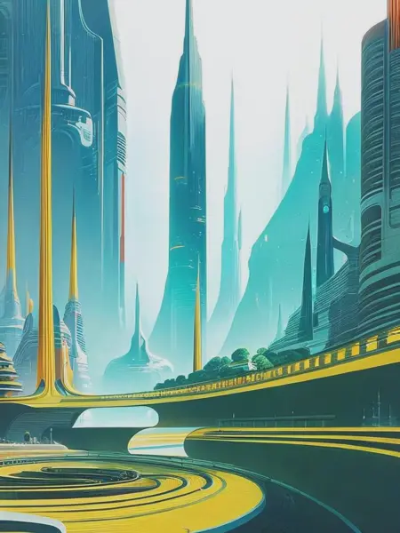 通过精细的插画与概念艺术,舒坦描绘了一个城市与自然和谐共存的未来图景。他构想出垂直花园、绿色屋顶以及优先考虑人类与地球福祉的可持续交通系统。