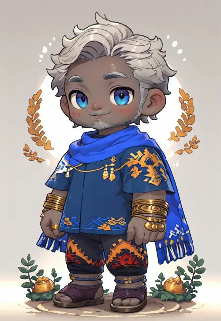 披风, 蓝色披风, 围巾, 蓝色围巾, 凉鞋, 深灰色凉鞋, 脚链, 饰品, 戒指, 手镯, 金色, 裤子, 沙勒裤, 灰色裤子, 带图案的服装