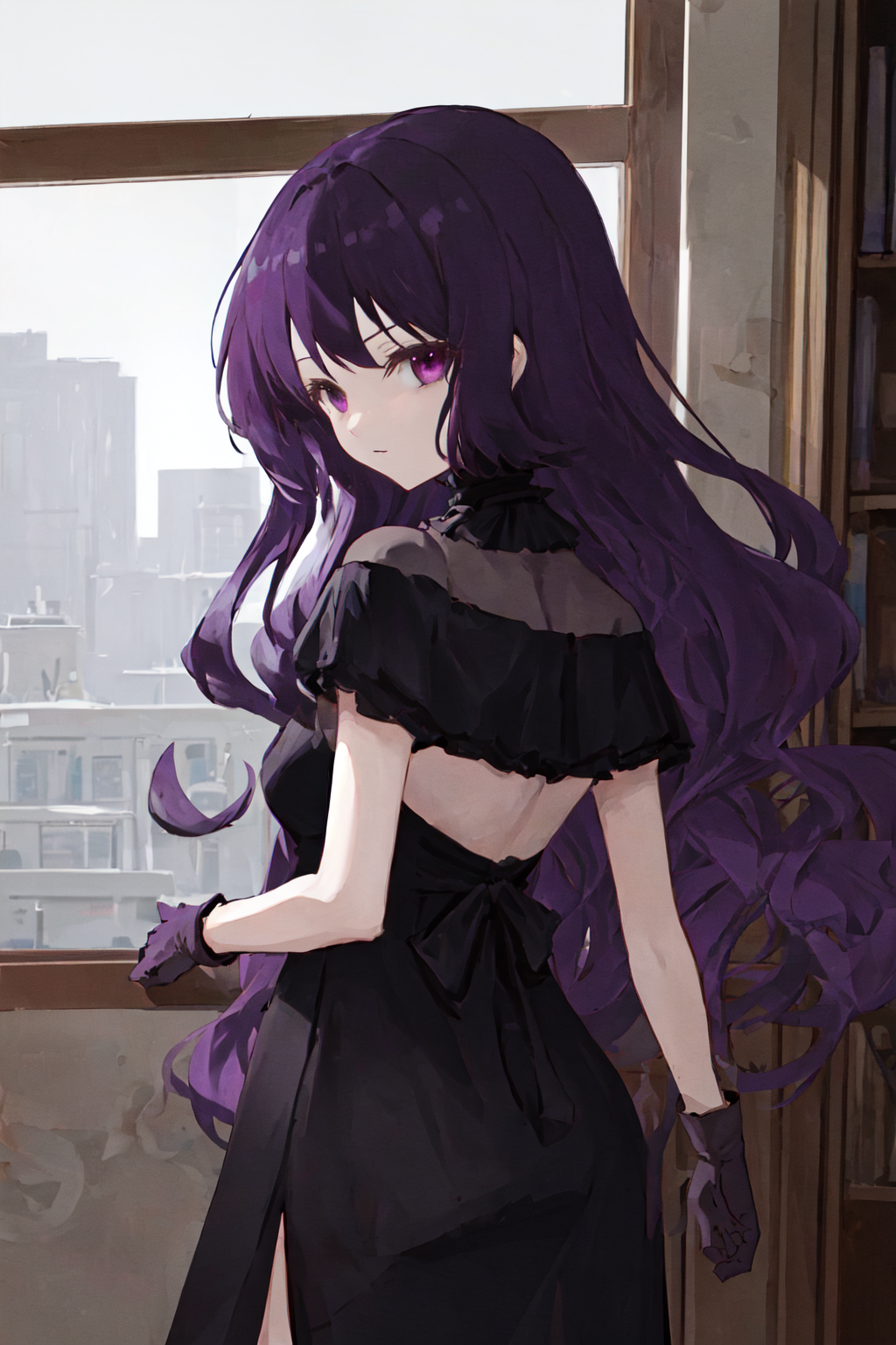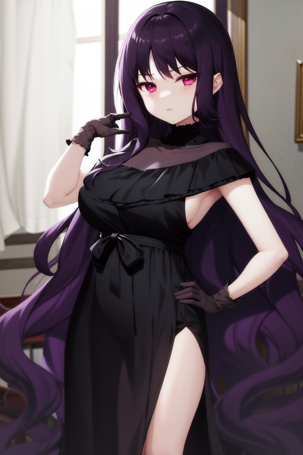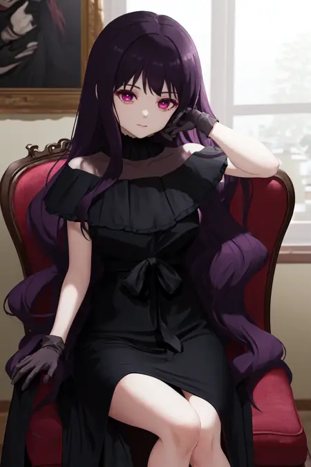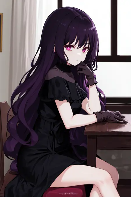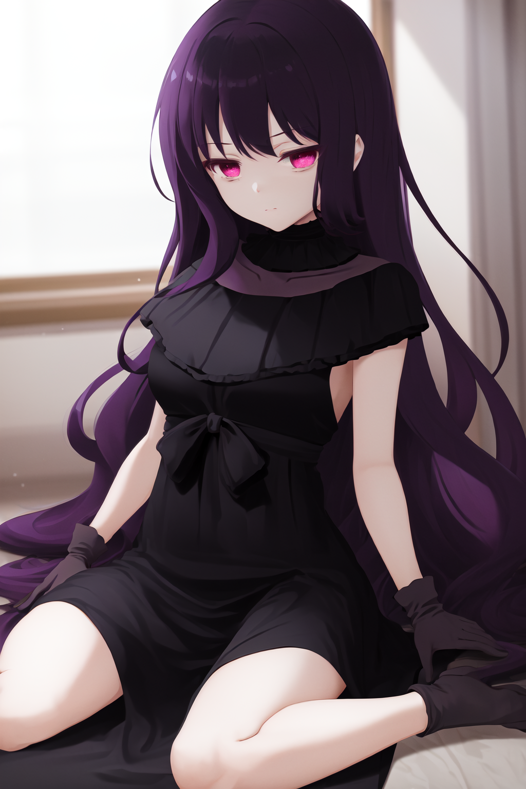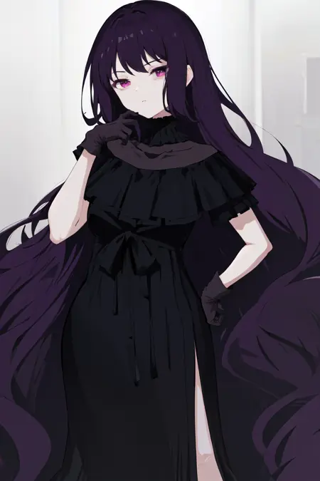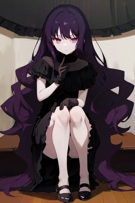 Default outfit: black choker black dress long dress black gloves black bow frills