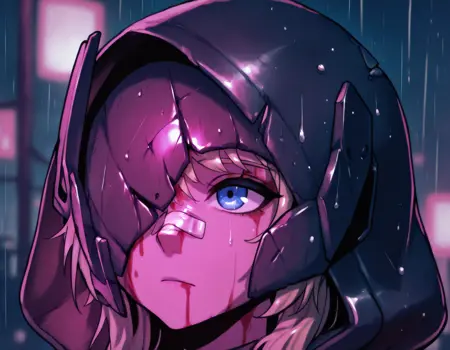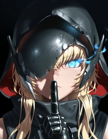 Basic tags (Can get most of the look): 1girl, blonde hair, blue eyes, broken mask, hood up, sidelocks, micro shorts, midriff, black crop top, black gloves, thigh strap, black cloak